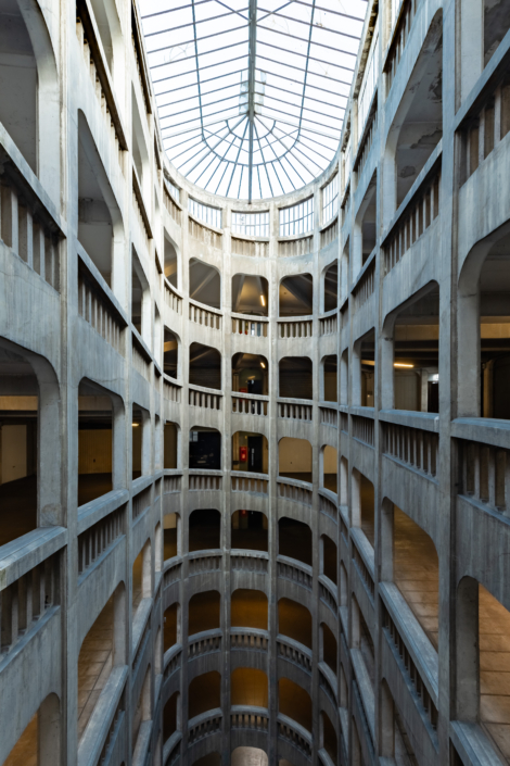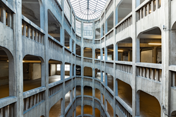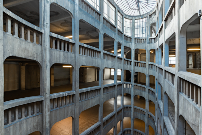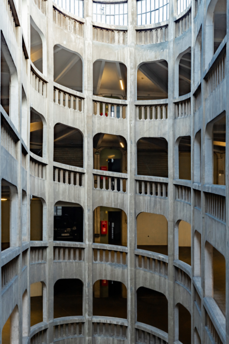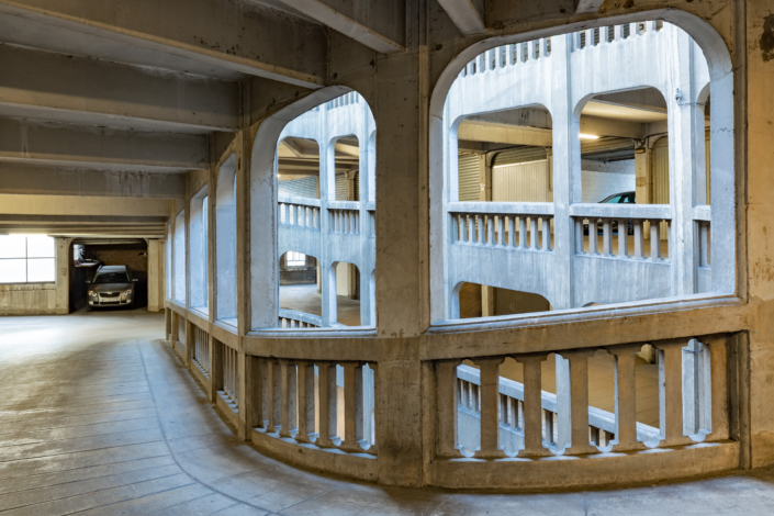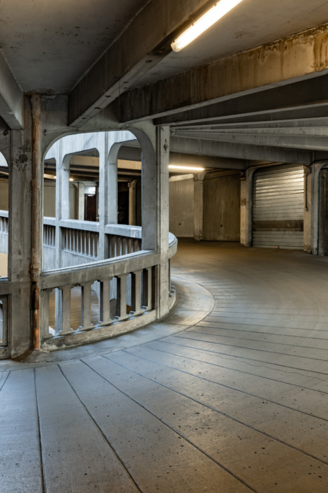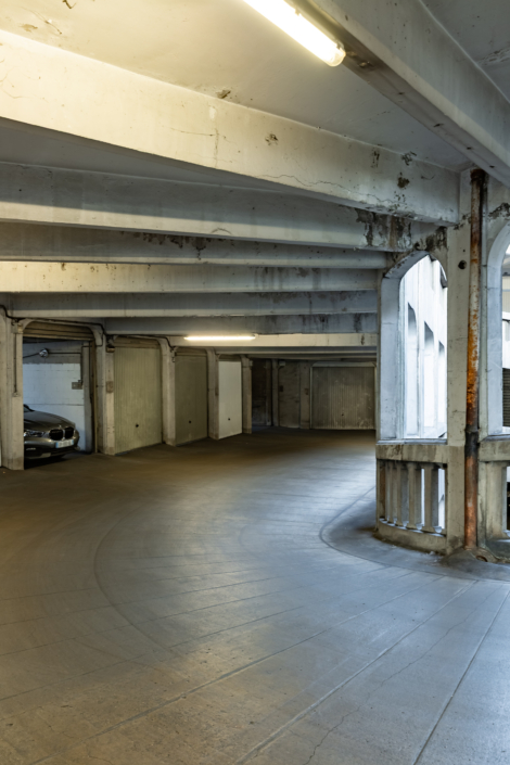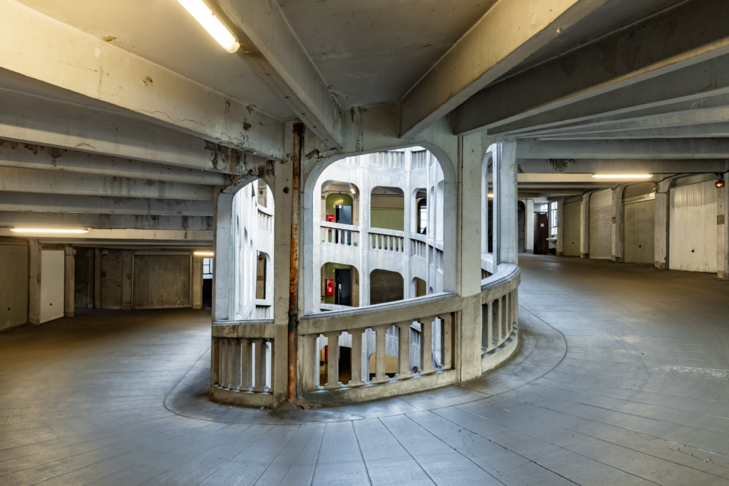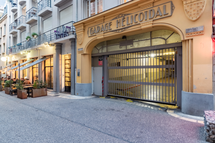 L’entrée du garage, une petite façade discrète, est insérée dans un immeuble d’habitation de style Art Déco rue Bressieux, ne laissant rien deviner de l’incroyable spirale cachée à l’intérieur.