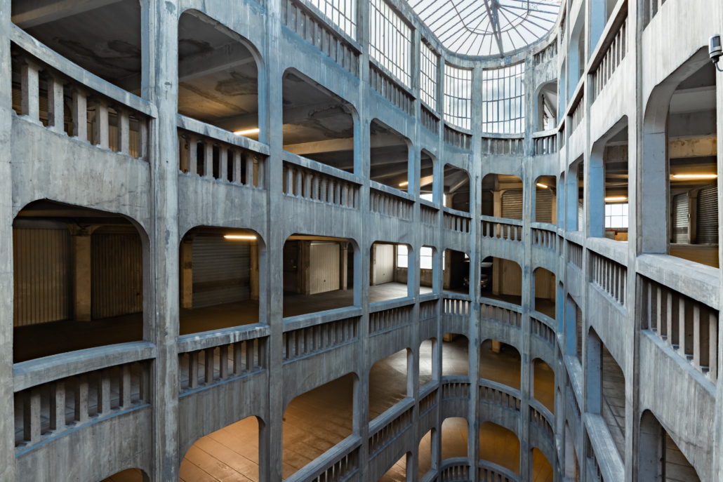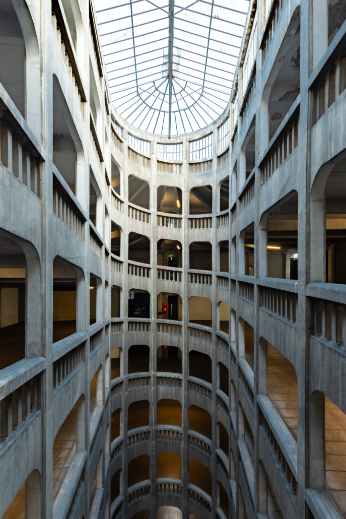 Le garage est une œuvre marquante de l’Art Déco, alliant fonctionnalité et esthétique de la modernité avec sa forme particulière, dite hélicoïdale. Il est construit sur sept niveaux autour d’un immense puits de lumière central. La voie de circulation en béton armé s’enroule continuellement autour de ce puits. Ce puits, couronné par une grande verrière, est la signature du lieu. Il assure un éclairage naturel maximal et offre un spectacle vertigineux vu d’en bas ou d’en haut.