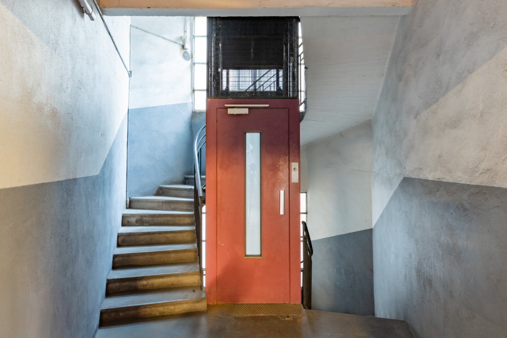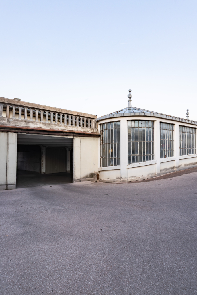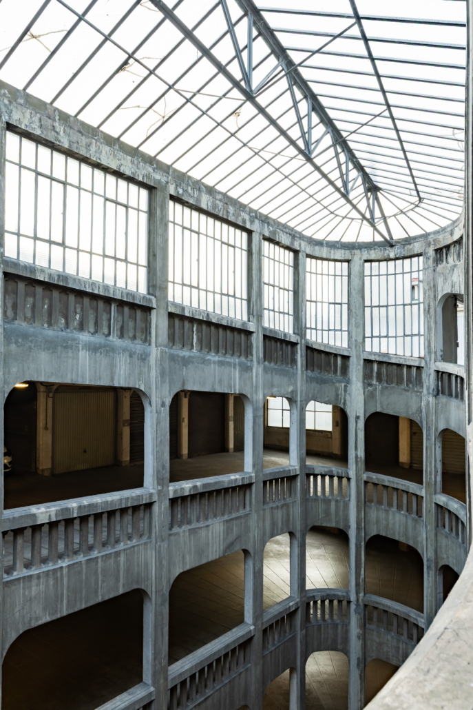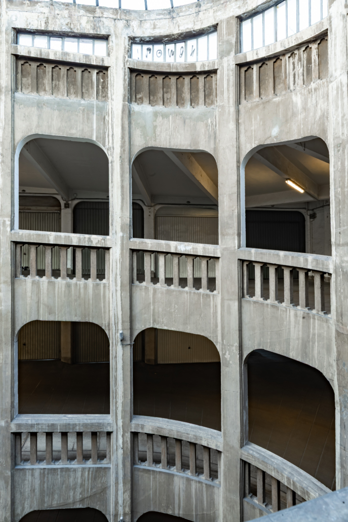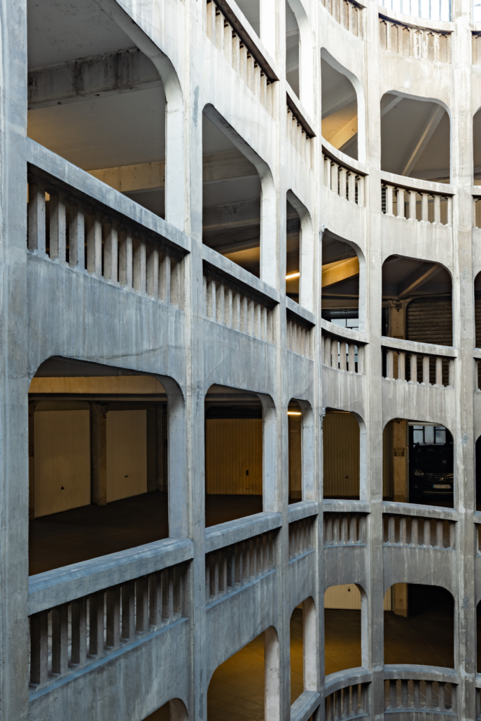L’entrée du garage, une petite façade discrète, est insérée dans un immeuble d’habitation de style Art Déco rue Bressieux, ne laissant rien deviner de l’incroyable spirale cachée à l’intérieur.